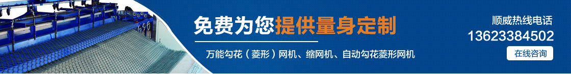| 安平縣順威絲網(wǎng)機械設(shè)備制造有限公司自產(chǎn)自銷,省去中間環(huán)節(jié),讓利給客戶,真正的讓您省錢。主要產(chǎn)品有:萬能勾花(菱形)網(wǎng)機、縮網(wǎng)機、自動勾花菱形網(wǎng)機、全自動勾花菱形網(wǎng)機。 |